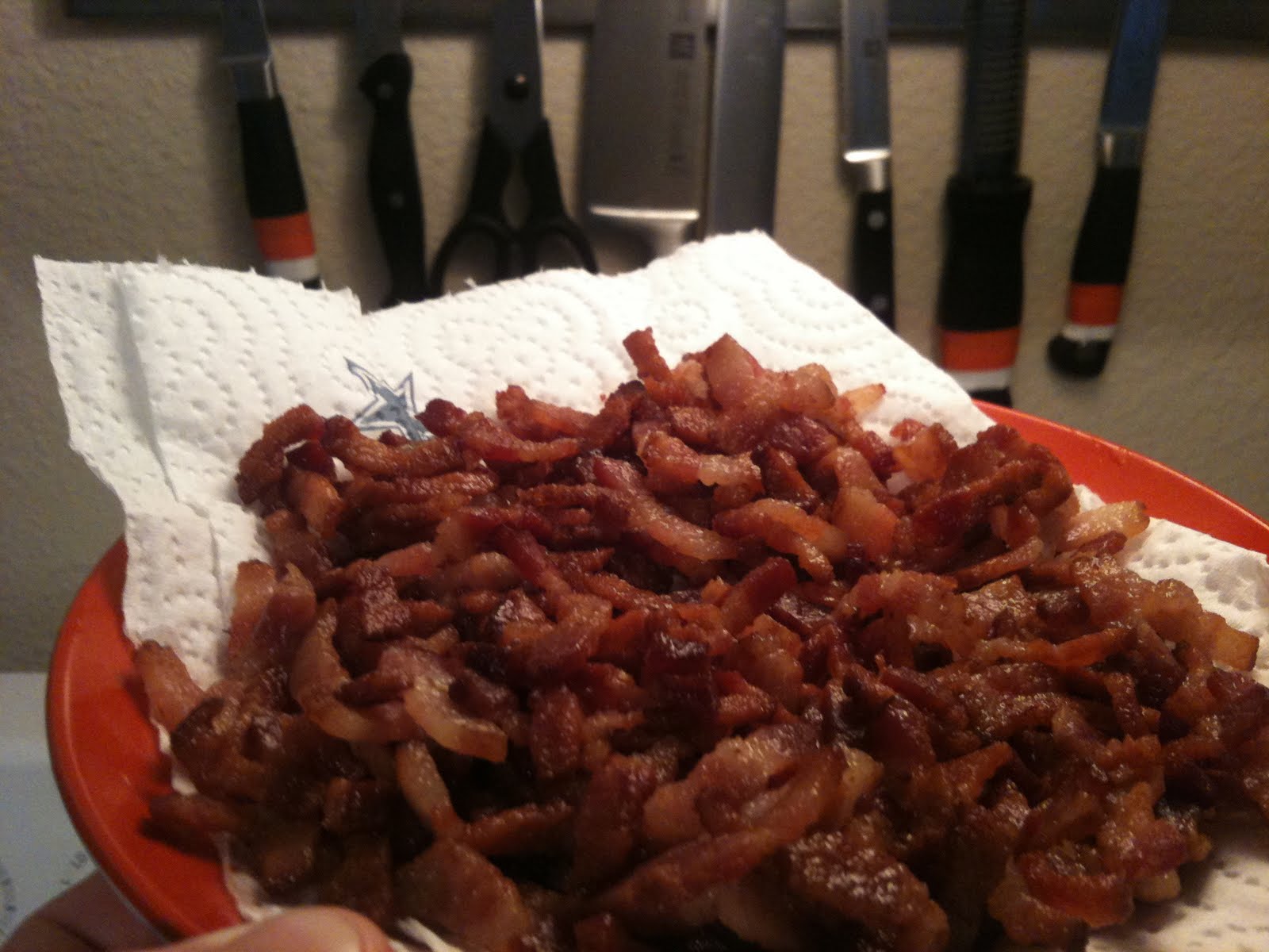 Next up, I trimmed and seasoned a pork tenderloin, and wrapped it in bacon. Set aside.